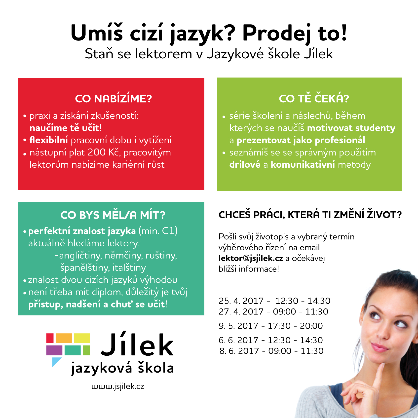 >> čti dálV Jazykové škole Jílek pohlížíme na jazykové kurzy očima studentů. Vše, co děláme, je zaměřeno na to, abyste dosáhli maximálního pokroku, cítili se příjemně a pozitivně motivováni. Jen tak může být výuka jazyka dlouhodobě efektivní a smysluplná. Díky více jak třicetileté praxi nabízíme osvědčený a komplexní systém vzdělávání postavený na propojení drilové a komunikativní metody, který zajišťuje studentům ty nejlepší výsledky. Jazykové kurzy u nás probíhají celoročně ve třech semestrech.