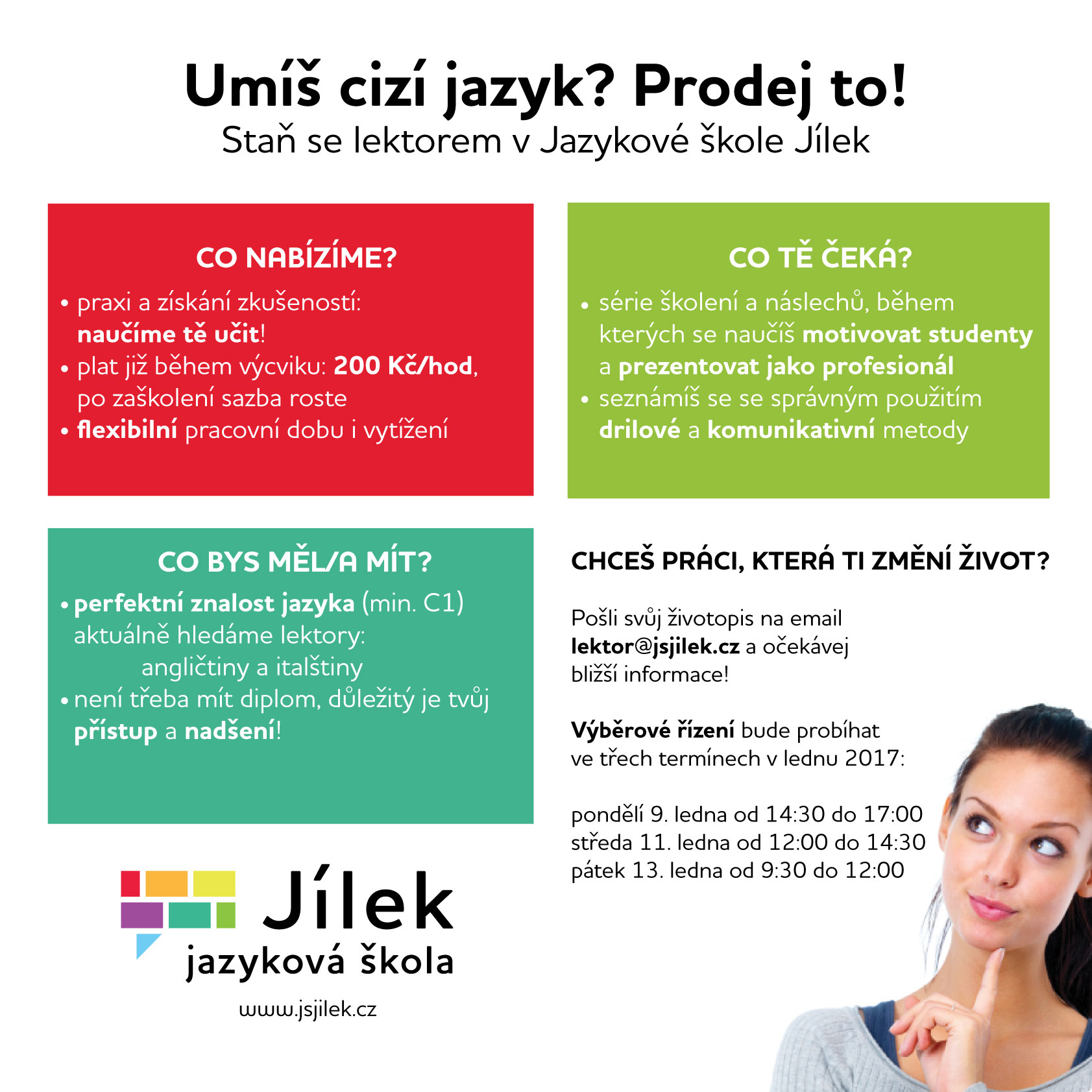 >> čti dálV Jazykové škole Jílek pohlížíme na jazykové kurzy očima studentů. Vše, co děláme, je zaměřeno na to, abyste dosáhli maximálního pokroku, cítili se příjemně a pozitivně motivováni. Jen tak může být výuka jazyka dlouhodobě efektivní a smysluplná. Díky více jak třicetileté praxi nabízíme osvědčený a komplexní systém vzdělávání postavený na propojení drilové a komunikativní metody, který zajišťuje studentům ty nejlepší výsledky. Jazykové kurzy u nás probíhají celoročně ve třech semestrech.